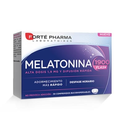 La melatonina FLASH de Forte Pharma está diseñada para ayudar en casos de dificultad para conciliar el sueño y aliviar la sensación de desfase horario (jet-lag). Cada comprimido contiene 1,9 mg de melatonina, un compuesto que contribuye a reducir el tiempo necesario para dormir y a mitigar los efectos del desfase horario. Este producto, con sabor a vainilla, no provoca adicción. Se recomienda tomar 1 comprimido al día, dejándolo disolver bajo la lengua sin beber agua; esto debe hacerse en el momento de acostarse en caso de dificultad para dormir. Para el desfase horario, se sugiere tomar 1 comprimido al día desde el primer día del viaje y durante los días siguientes hasta que los efectos del desfase ya no se sientan.